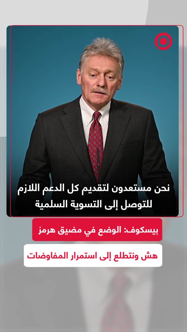 Play/Pause Mute/Unmute بيسكوف: الوضع في مضيق هرمز هش ونتطلع إلى استمرار المفاوضات Save post Share Facebook X VK.com Telegram